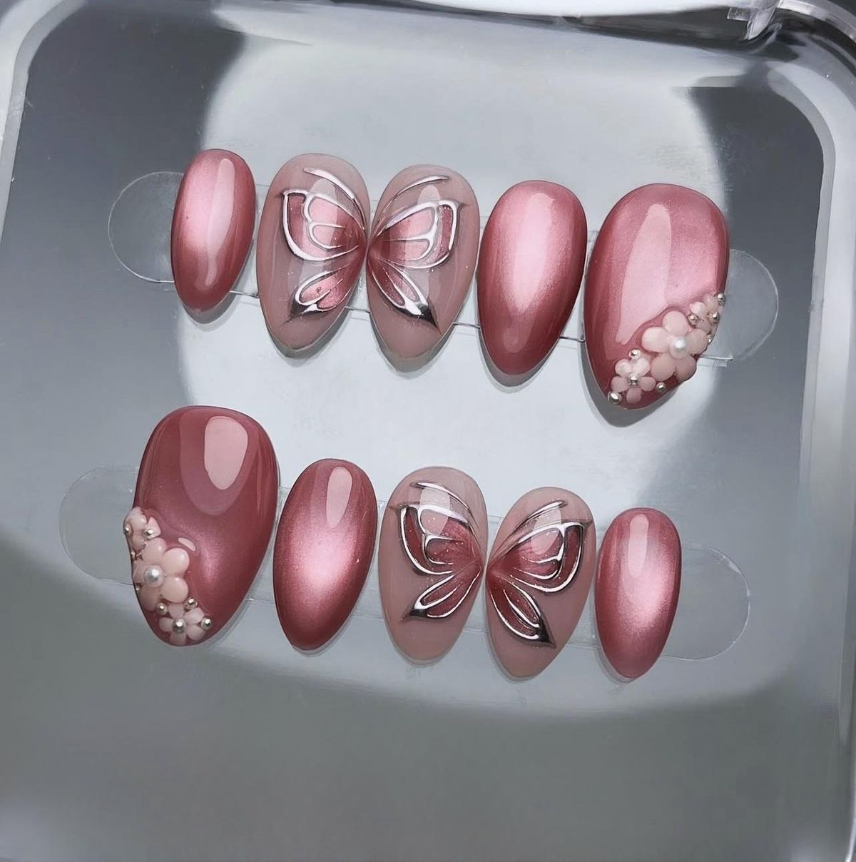 - Butterfly Charm Nails – Adorned with delicate 3D crystal butterflies and gems, these standout nails bring a fairytale finish.