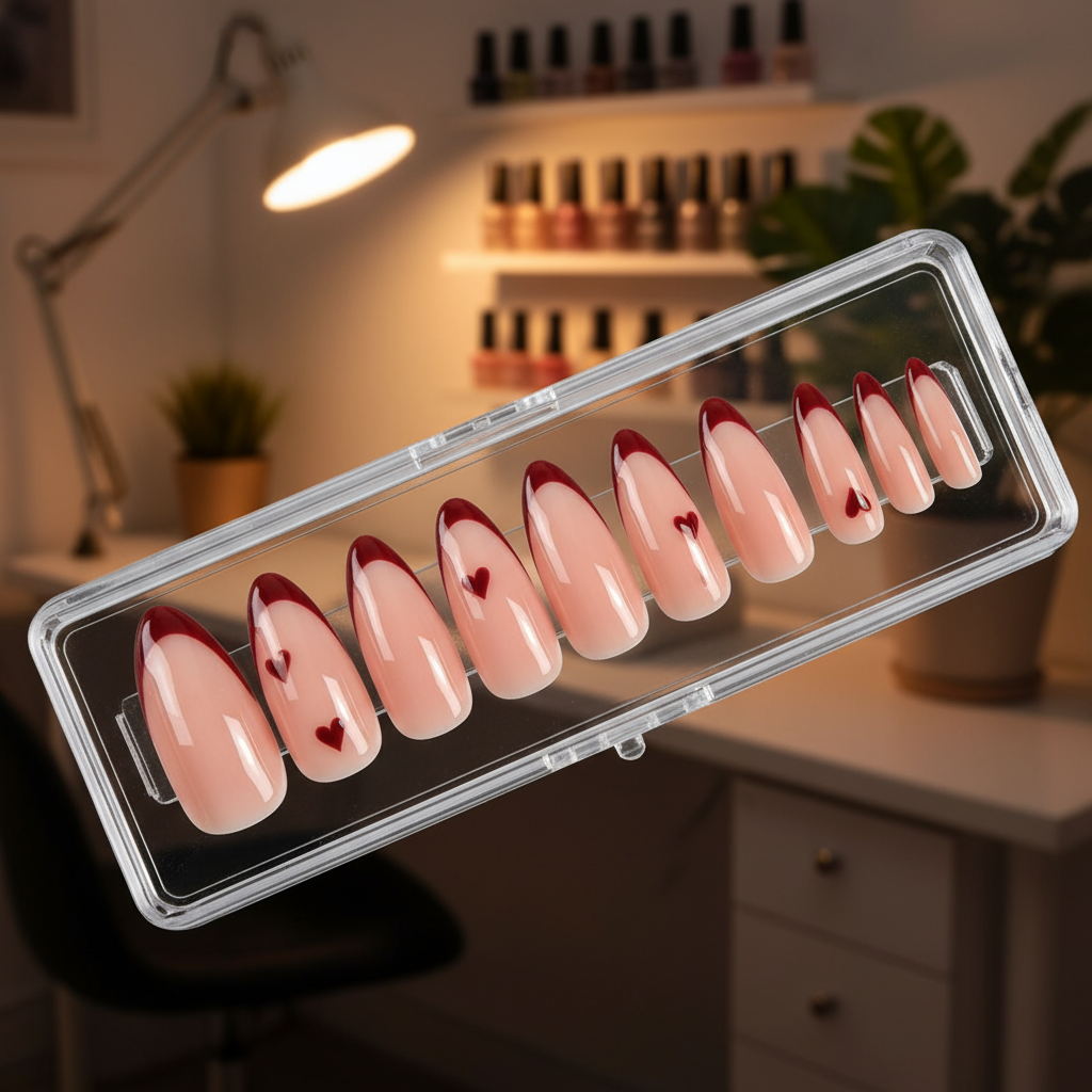 - Unique Designs: A mix of hand-painted hearts, shimmering red glitter, and subtle rhinestone embellishments on a soft, neutral base.